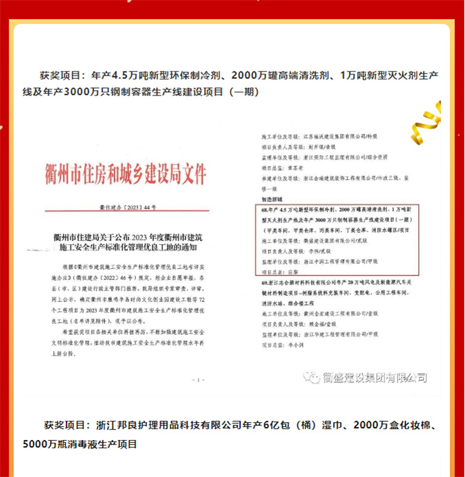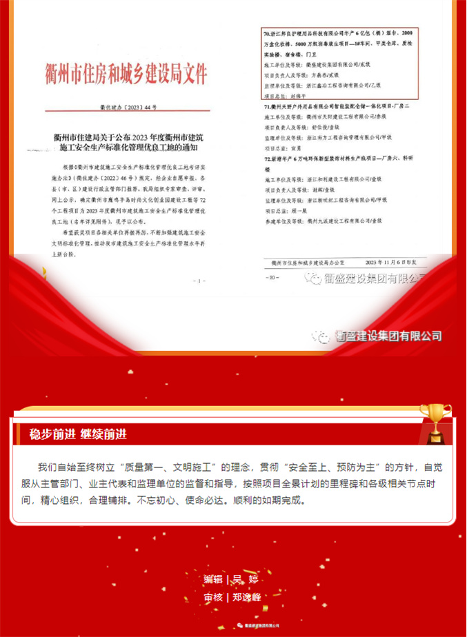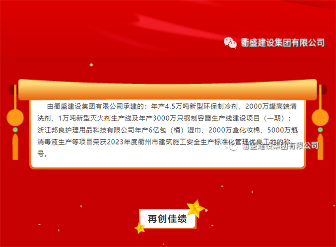 热烈祝贺【衢盛建设集团有限公司】承建的两项目荣获“2023年度衢州市建筑施工安全生产标准化管理优良工地”称号